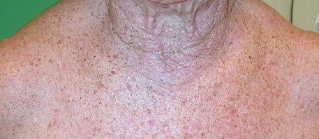 Cuando el daño es más importante, aparecen sobre la piel dañada pequeñas pápulas costrosas, ásperas al tacto, que recuerdan a heridas en curación, pero que no se curan. Estas lesiones, llamadas queratosis, tienden a desprenderse periódicamente, dando la impresión durante unos días de haberse curado, para reaparecer de nuevo en unas semanas con el mismo aspecto.