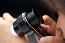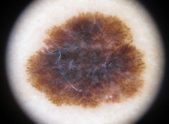 (2) el diagnóstico precoz: La dermatoscopia digitalizada permite primero visualizar las lesiones pigmentadas con un microscopio de luz polarizada, para detectar signos de alarma, y segundo registrarlas en un sistema informático que permita su posterior almacenaje para el estudio y seguimiento de sus cambios evolutivos en sucesivas visitas.